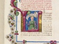Oxford, Bodleian Library, Holkham misc. 49, f. 105r. Busto di Dioneo, re della settima giornata, all'interno dell'iniziale figurata O(gni).