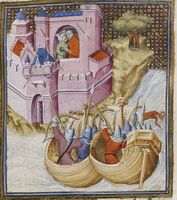 Parigi, Bibliothèque Nationale de France, Fr. 598, f. 51r. Elena e Paride si trovano all'interno delle mura di Troia, mentre due navi della flotta greca attaccano la città.