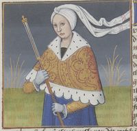 Parigi, Bibliothèque Nationale de France, Fr. 599, f. 39v. Il copista del manoscritto è Johannes Michel. Nicaula, regina d'Etiopia, con uno scettro.