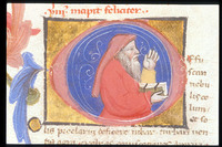 Londra, British Library, Egerton 1865, f. 44r. Il manoscritto è datato 23 giugno 1388. Un uomo con la barba a mezzobusto vestito di rosso con un libro, all'interno dell'iniziale fi…