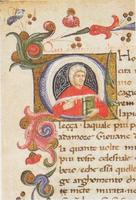 Venezia, Biblioteca della Fondazione Querini Stampalia, VI.2, f. 1r. Busto dell'autore Giovanni Boccaccio con una veste rossa ed un libro tra le mani, all'interno dell'iniziale fig…