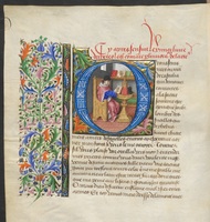 Vienna, Österreichische Nationalbibliothek, 2617, f. 17v. L'autore Giovanni Boccaccio siede nel suo studio intento a leggere un libro, all'interno dell'iniziale istoriata O (vous).