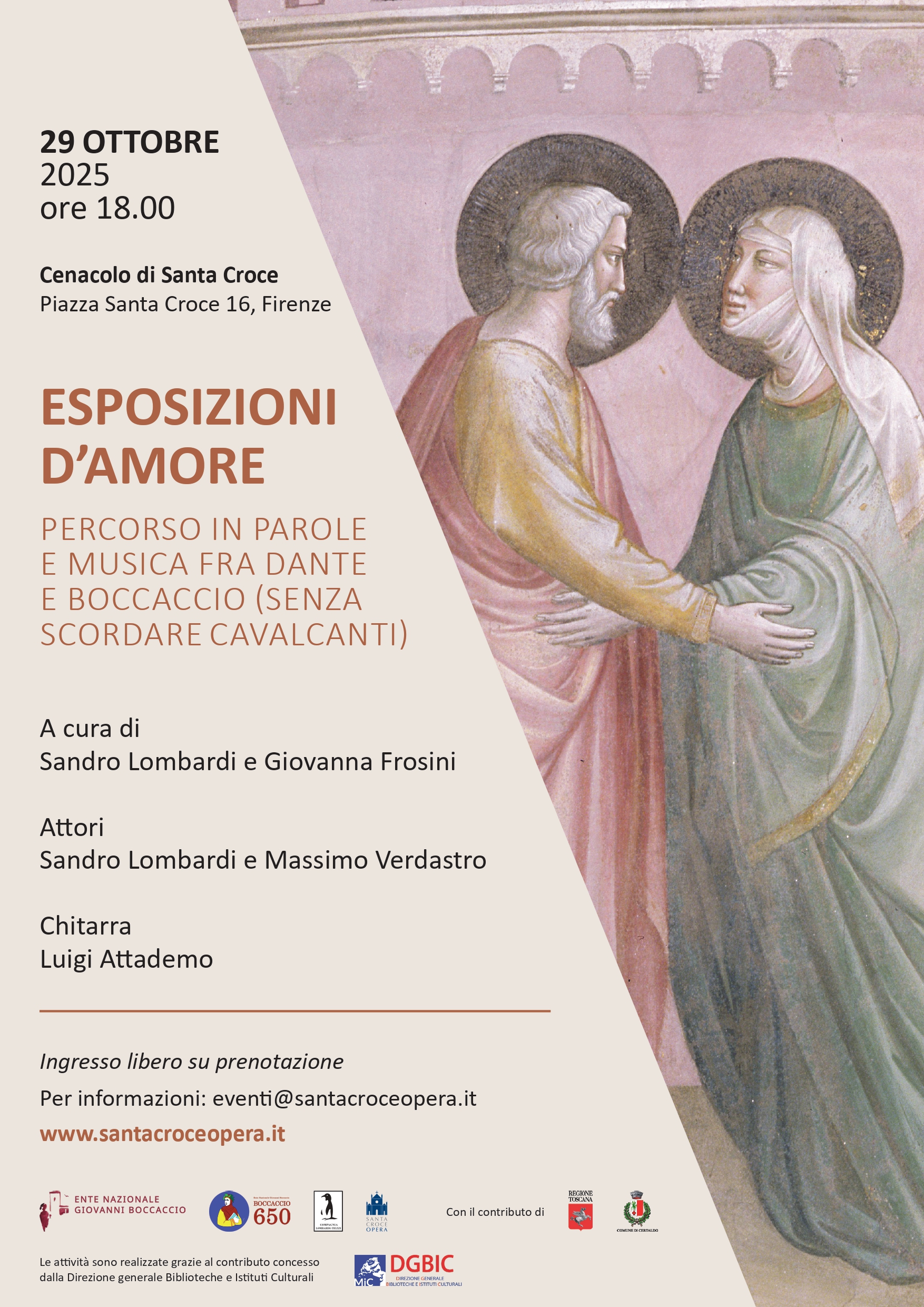 Nell’ambito delle celebrazioni dell’Ente Nazionale Giovanni Boccaccio per i 650 anni dalla morte dello scrittore, si situa il recital Esposizioni d’Amore, un percorso tra Boccaccio e Dante, con anche uno sguardo a Guido Cavalcanti. Si tratta di un montaggio di testi, elaborato da Giovanna Frosini e Sandro Lombardi, tesi a evidenziare la lunga fedeltà di Boccaccio nei confronti di Dante. In particolare si darà lettura di frammenti dal Trattatello in laude di Dante, come anche dalle note di commento ad alcuni passi danteschi. Al tema dell’amore tragico, a mo’ di commento al quinto canto dell’Inferno, ecco la novella prima della quarta giornata, dove si racconta la triste vicenda di Guiscardo e Ghismonda. Particolarmente suggestivi sono i due racconti della perdita e ritrovamento dei primi sette canti del poema e degli ultimi tredici del Paradiso. A dare corpo a queste narrazioni saranno le voci di Sandro Lombardi e Massimo Verdastro, introdotti e accompagnati dalla chitarra di Luigi Attademo.