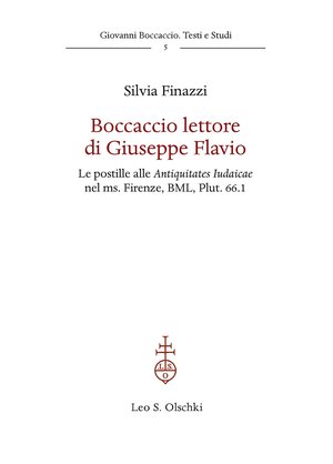 Il volume offre l’edizione integrale e commentata delle oltre 1000 annotazioni lasciate da Boccaccio, insieme a quattro piccoli disegni, in margine alle Antiquitates Iudaicae di Giuseppe Flavio nel ms. Plut. 66.1 della Biblioteca Medicea Laurenziana di Firenze. Si tratta di un codice in scrittura beneventana prodotto a Montecassino nel secolo XI, che trasmette il testo nella traduzione latina cassiodorea. L’edizione è preceduta da uno studio introduttivo nel quale si fornisce la descrizione del manoscritto, si affrontano il problema della datazione e dell’attribuzione di note e disegni, si propone una distinzione tipologica di tutti gli interventi boccacciani e infine si illustrano i criteri editoriali adottati.