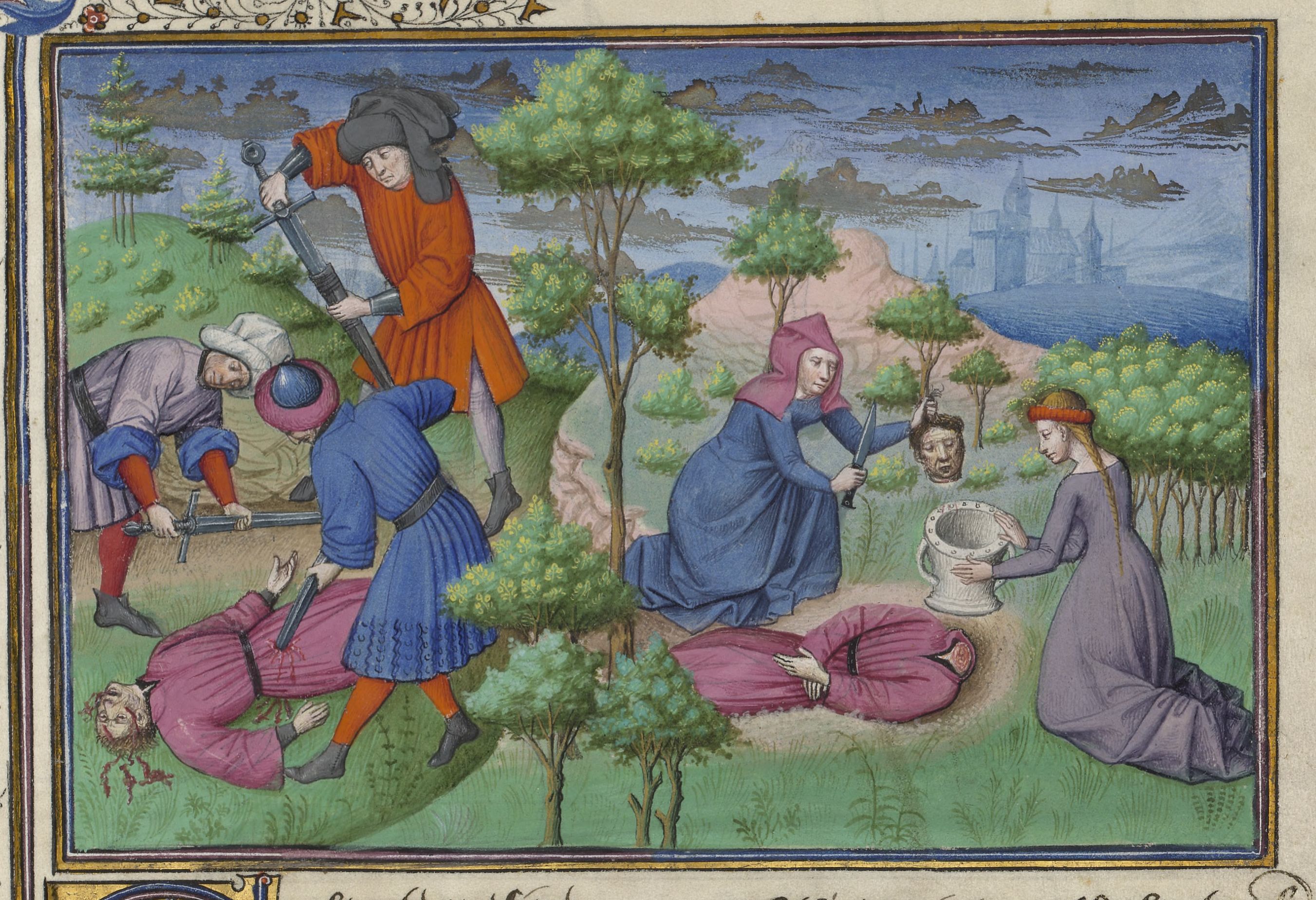Parigi, Bibliothèque de l'Arsenal, 5070, f. 162r. Il copista del manoscritto è Guillebert de Mets. Lorenzo, amante di Lisabetta, viene ucciso dai tre fratelli di lei; Lisabetta, con l'aiuto di un domestica, dissotterra il corpo dell'amato, gli taglia la testa e la nasconde in un vaso di basilico.