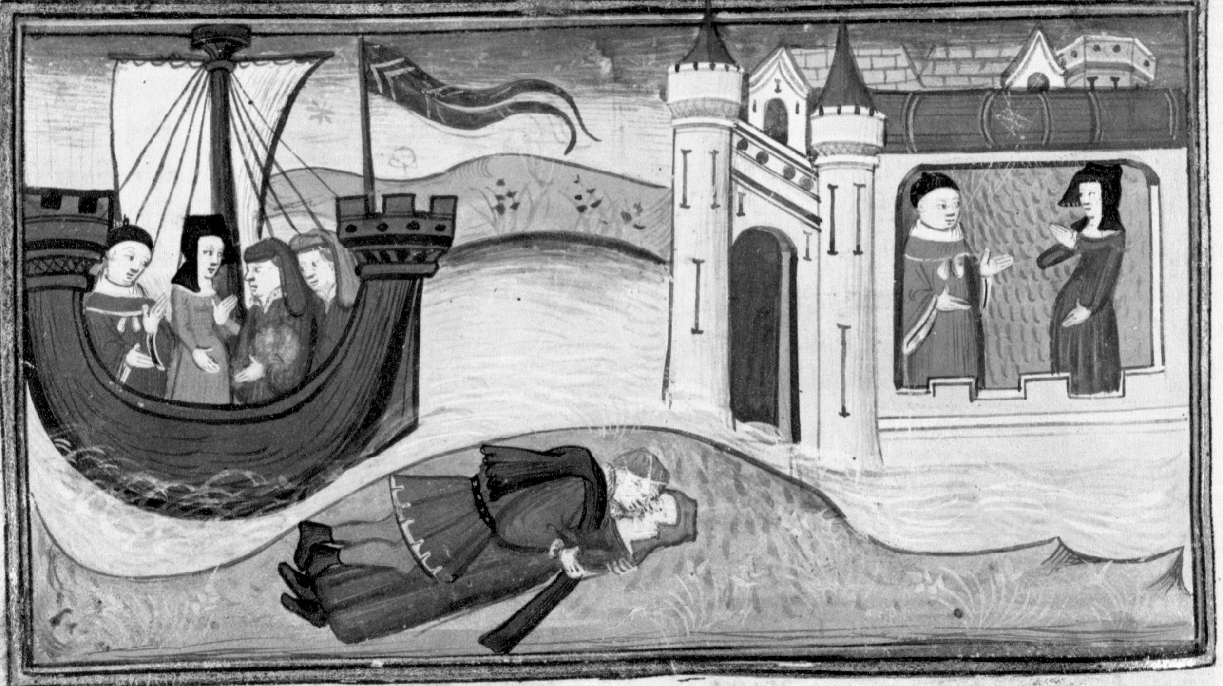 Parigi, Bibliothèque Nationale de France, Fr. 12421, f. 105v. Il corsaro Paganino rapisce la moglie di Ricciardo davanti agli occhi del marito; Paganino giace con Bartolomea; nella dimora di Paganino a Monaco, Bartolomea comunica al marito di non voler tornare a casa con lui.