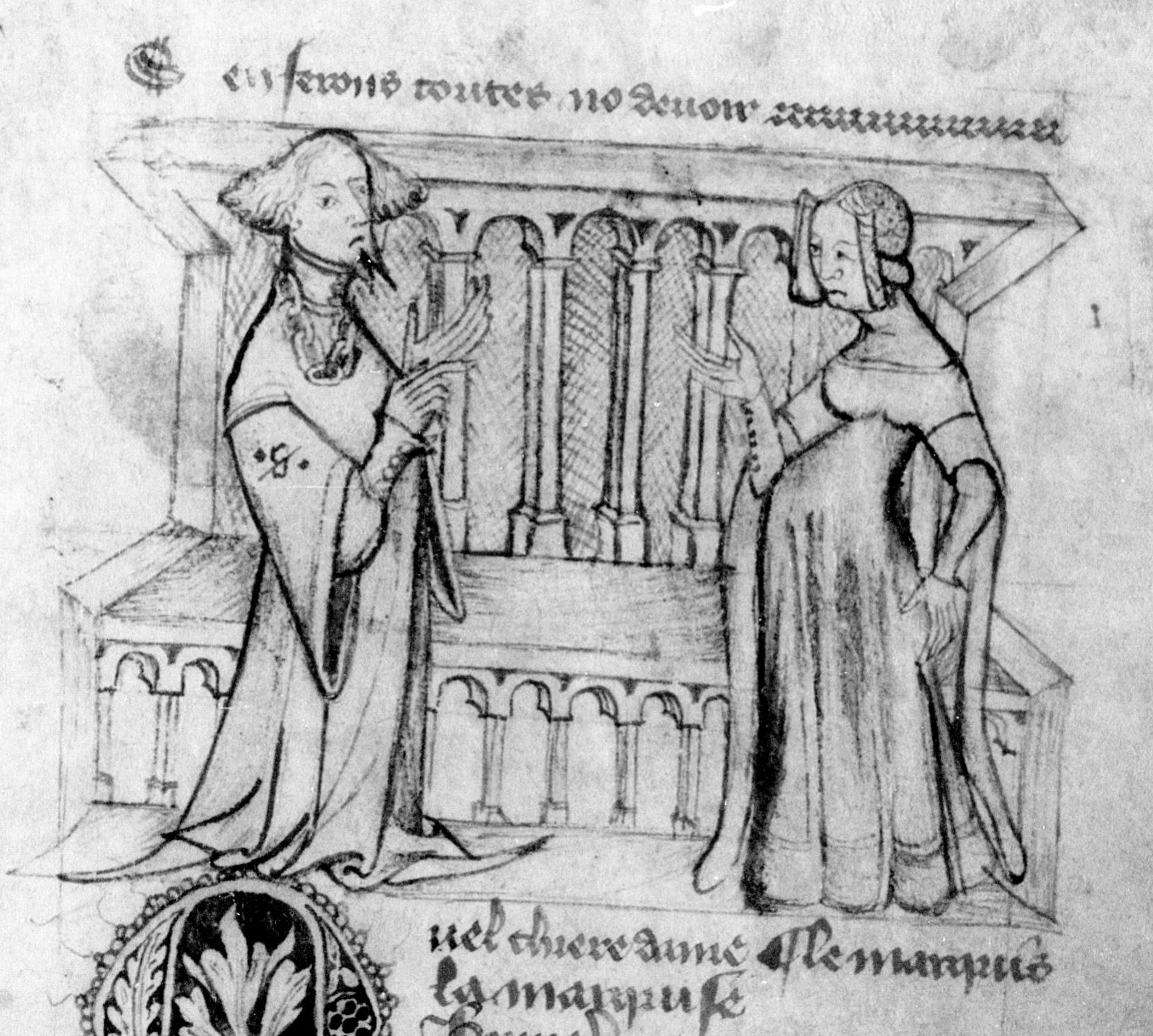 Parigi, Bibliothèque Nationale de France, Fr. 2203, f. 33r. Il manoscritto è datato 1395. Gualtieri a colloquio con Griselda.