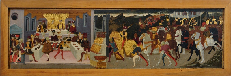 Venezia, Museo Correr, inv. n. Cl. I n. 0006. Pericone spinge Alatiel ad ubriacarsi durante un banchetto per poterla sedurre (?); un gruppo di uomini armati si dirige verso il castello (l'identificazione del soggetto rimane dubbia). Fronte di cassone, secondo pannello di una coppia.