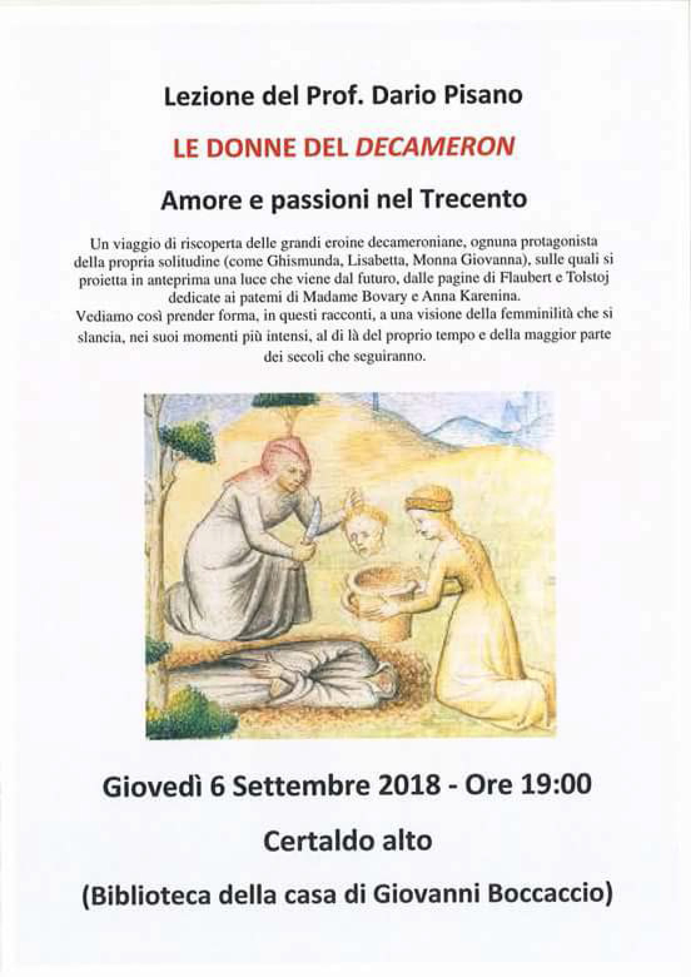 Un viaggio di riscoperta delle grandi eroine decameroniane, ognuna protagonista della propria solitudine (come Ghismunda, Lisabetta, Monna Giovanna), sulle quali si proietta in anteprima una luce che viene dal futuro, dalle pagine di Flaubert e Tolstoj dedicate ai patemi di Madame Bovary e Anna Karenina.