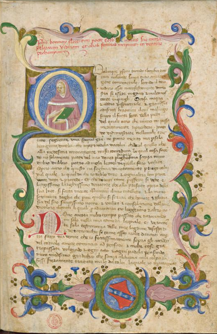 Firenze, Biblioteca Medicea Laurenziana, Plut. 90 inf. 49, f. 1r. Il copista del manoscritto, datato gennaio 1436, è Giovanni Vespucci. Ritratto a mezzobusto dell'autore Giovanni Boccaccio con un libro, all'interno dell'iniziale figurata Q(ualunque); nel margine inferiore del fregio decorativo è presente lo stemma dei Vespucci.