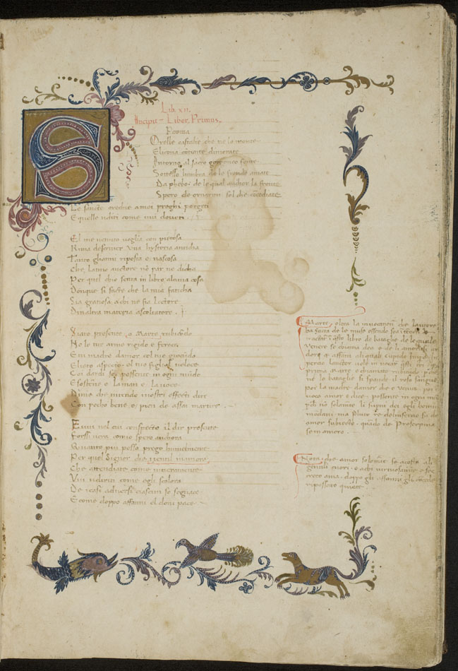 Chicago, University of Chicago Library, 541, f. 3r. Un delfino e un cane che insegue un uccello.