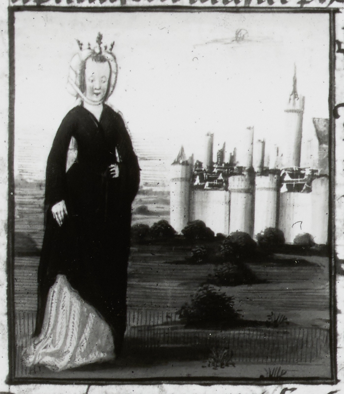 Dresda, Sächsische Landesbibliothek, F 171 b, f. 16v. La regina Libia sta dinanzi alle mura di un castello.