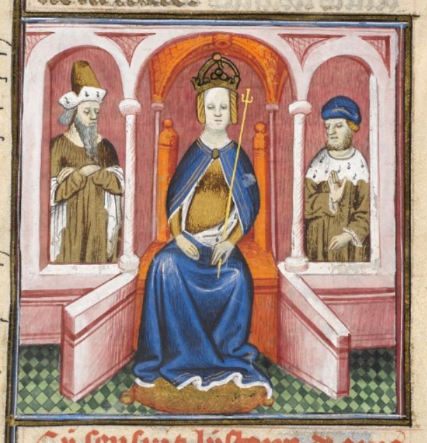 Londra, British Library, Royal 20 C V, f. 11r. Opi siede sul trono, fiancheggiata da due nobili sudditi.