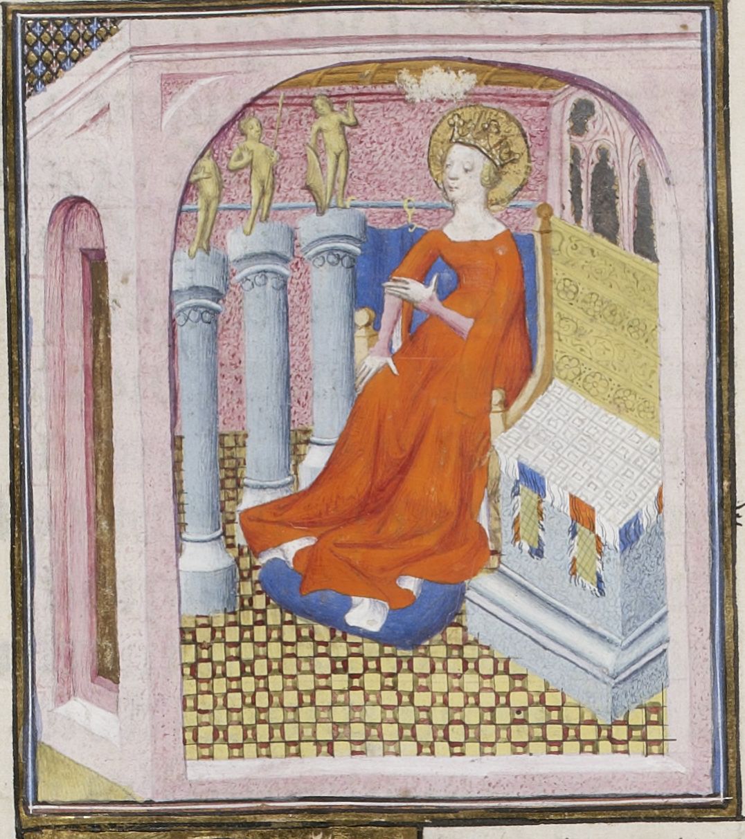 Parigi, Bibliothèque Nationale de France, Fr. 598, f. 10v. La dea Opi seduta all'interno di un tempio.