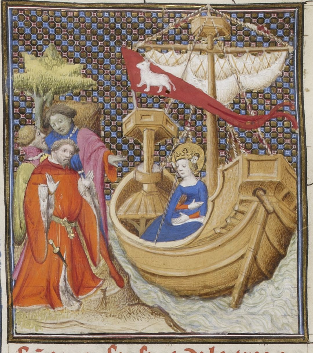 Parigi, Bibliothèque Nationale de France, Fr. 598, f. 16v. La dea Iside naviga verso l'Egitto, mentre tre uomini la osservano dalla riva.