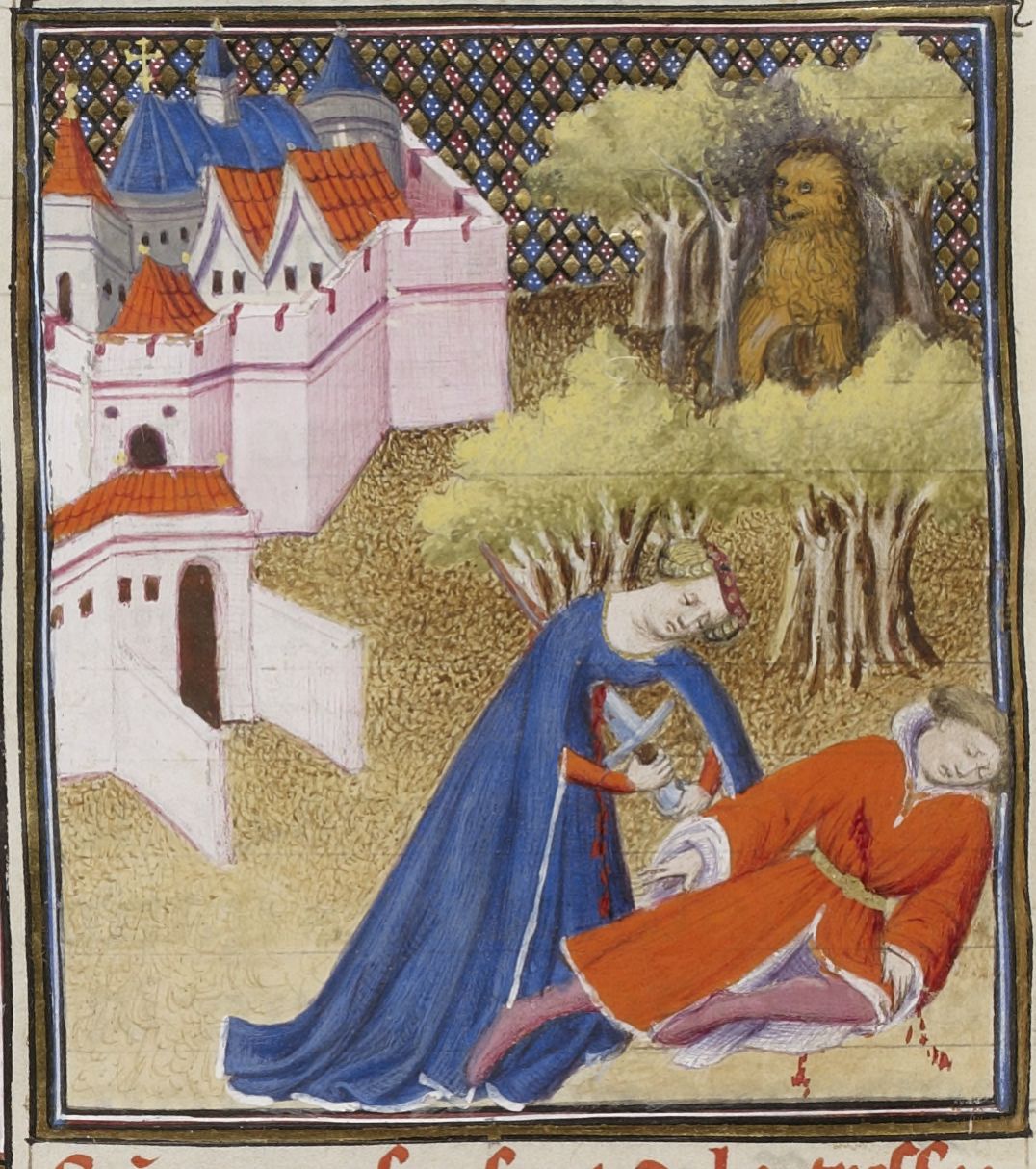 Parigi, Bibliothèque Nationale de France, Fr. 598, f. 20v. Tisbe compie il suicidio accanto al corpo di Piramo; una leonessa è nascosta tra gli alberi.