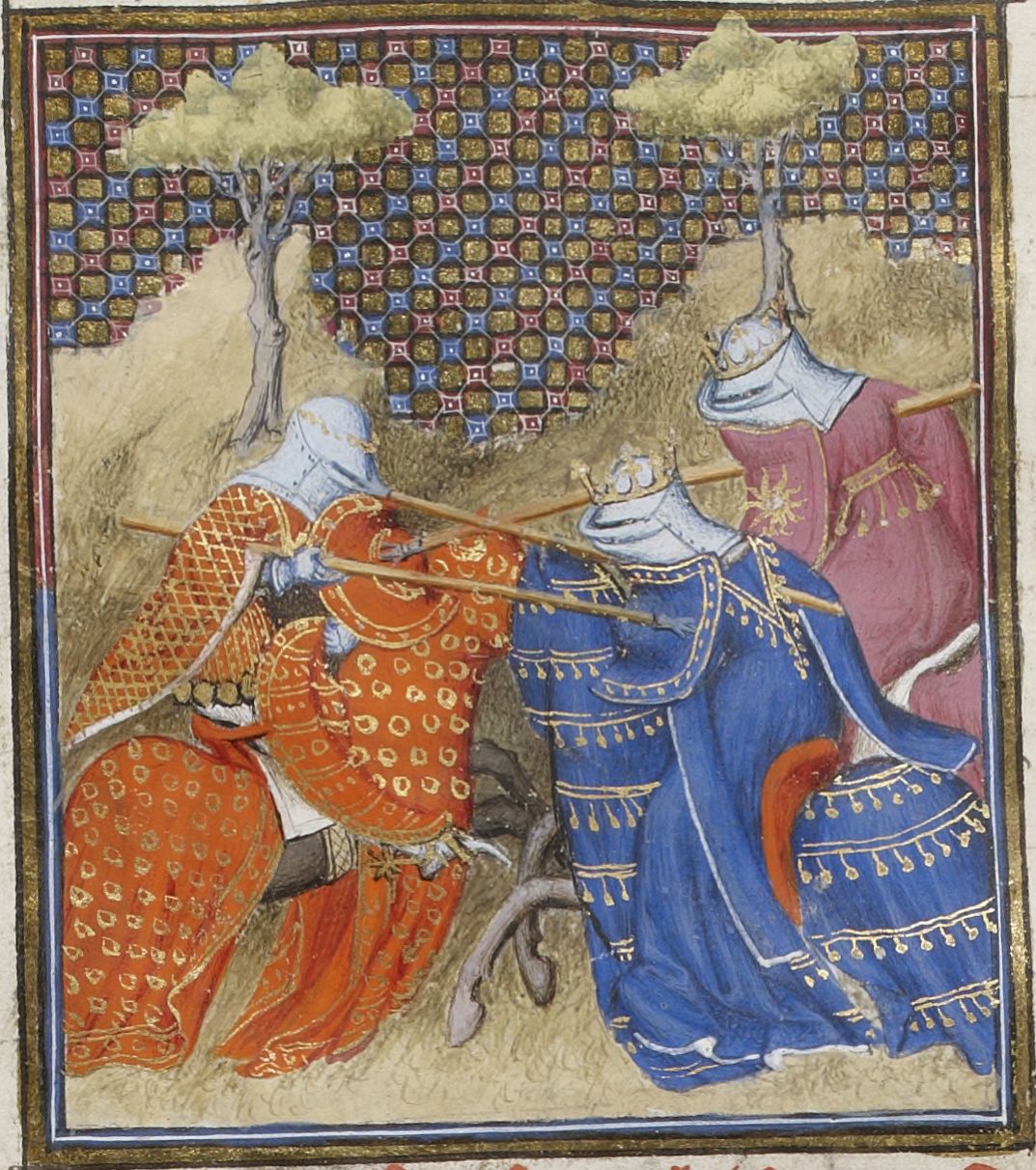 Parigi, Bibliothèque Nationale de France, Fr. 598, f. 30v. Orizia e Antiope si battono a cavallo e armate di lancia contro Ercole.