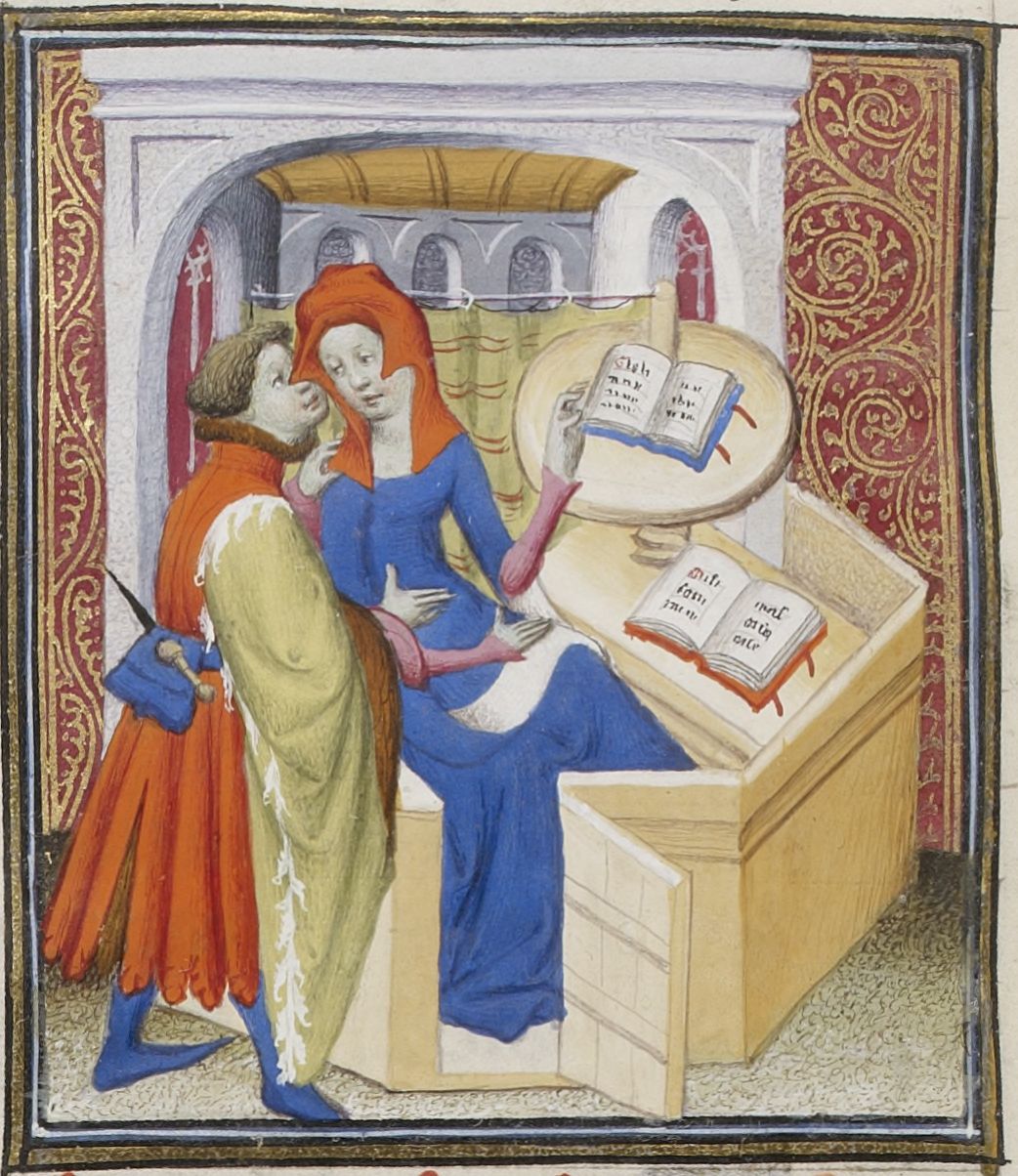 Parigi, Bibliothèque Nationale de France, Fr. 598, f. 92v. Leonzio, seduta ad un leggio, è corteggiata da un ammiratore.