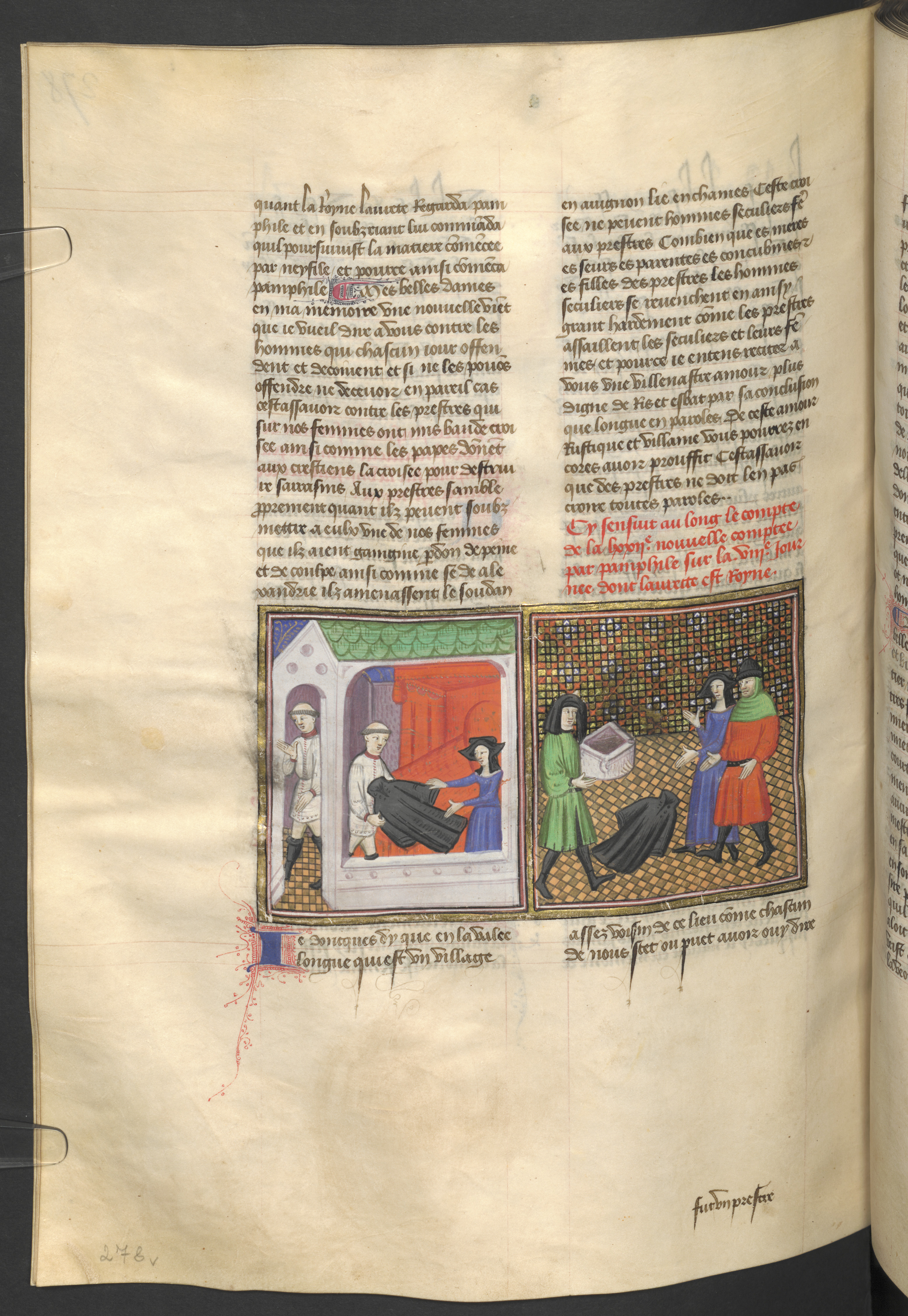 Vienna, Österreichische Nationalbibliothek, 2561, f. 278v. Il curato di Varlungo prima di andar via lascia in pegno il proprio mantello a monna Belcolore; un chierico riconsegna alla donna un mortaio per scambiarlo con il mantello.