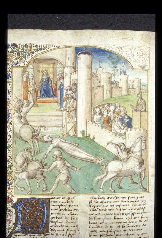 Londra, British Library, Harley 621, f. 369v. Brunichilde viene legata ai cavalli e squartata per ordine di Clotario, che siede nella sala del trono all'interno della città; Maometto, all'esterno della città, predica ad una folla seduta dinanzi a lui sul prato.