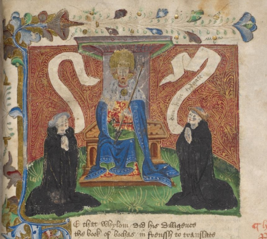 Londra, British Library, Harley 1766, f. 5r. Sant'Edmondo in trono venerato da due monaci benedettini inginocchiati in preghiera; entrambi i monaci reggono un cartiglio, quello di destra reca la scritta «John Lydgate» redatta con mano del XVI secolo.