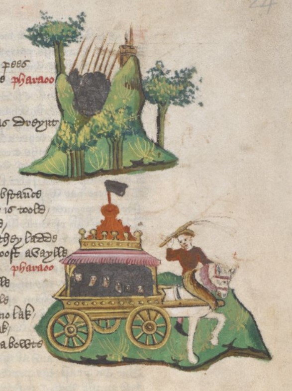 Londra, British Library, Harley 1766, f. 24r. Il Faraone in piedi tra due colline (?); il Faraone nel suo carro accompagnato da sei soldati.