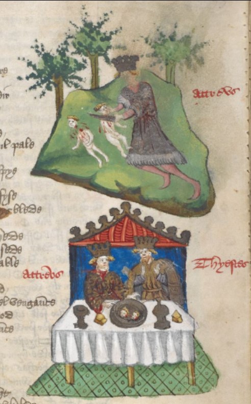 Londra, British Library, Harley 1766, f. 53r. Atreo decapita i figli di Tieste; Atreo organizza un banchetto per Tieste e gli fa servire le teste dei figli.