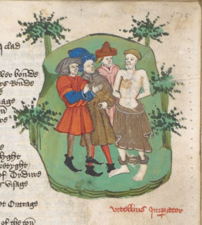 Londra, British Library, Harley 1766, f. 175r. L'imperatore Vitellio, fatto prigioniero, viene deriso da tre uomini.