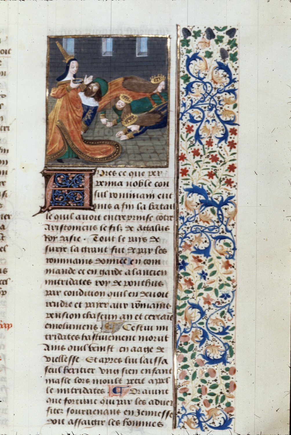 Londra, British Library, Royal 14 E V, f. 306r. Mitridate avvelena se stesso ed i suoi familiari.