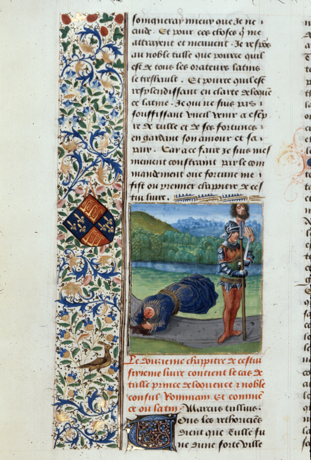 Londra, British Library, Royal 14 E V, f. 334v. Un soldato decapita Cicerone lungo la strada e pone la testa su una picca.