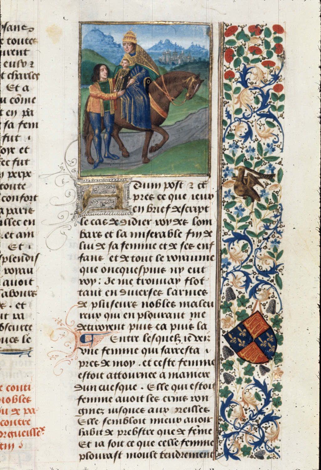 Londra, British Library, Royal 14 E V, f. 468r. La papessa Giovanna mentre percorre una strada di campagna a cavallo affida il figlio neonato ad un uomo.