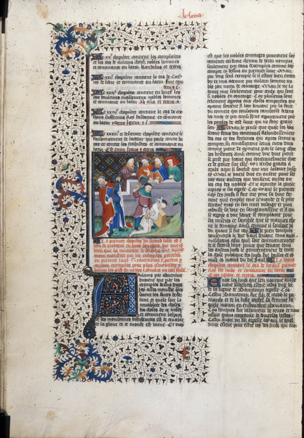 Londra, British Library, Royal 18 D VII, f. 29v. Saul compie il suicidio trafiggendosi con la spada; Davide ordina l'esecuzione degli Amaleciti.