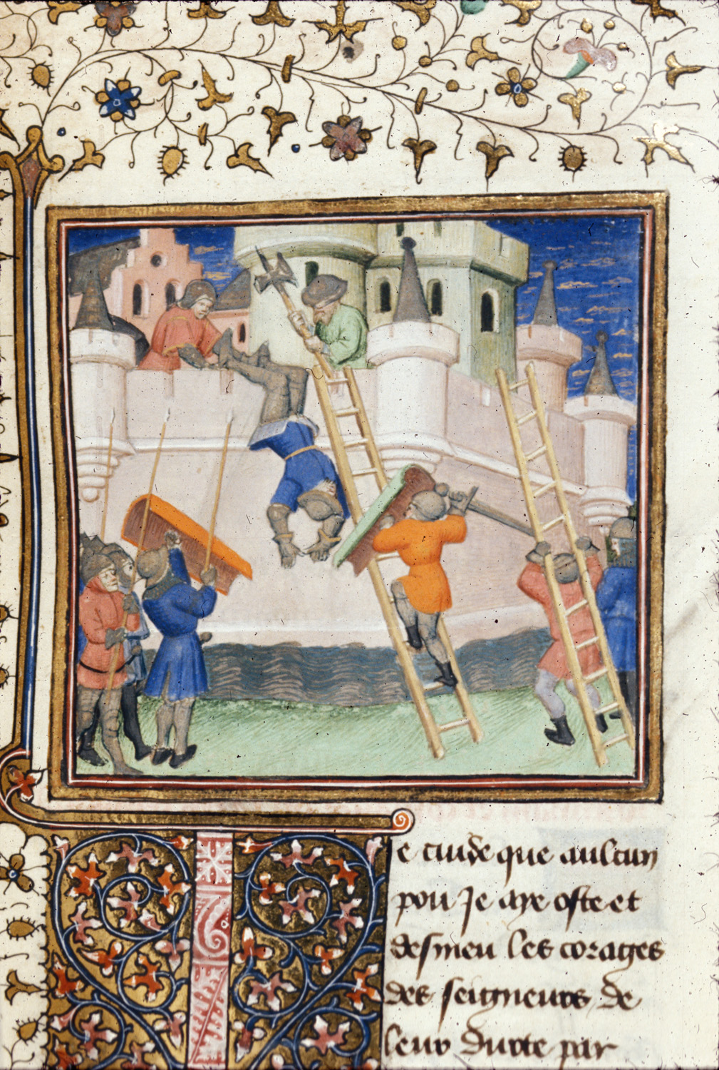 Londra, British Library, Royal 20 C IV, f. 119r. I Galli assediano le mura di Roma; dalle stesse mura Manlio Capitolino viene gettato nel fossato (testo mal compreso: rappresenta Manlio Capitolino gettato dalla rupe Tarpea).