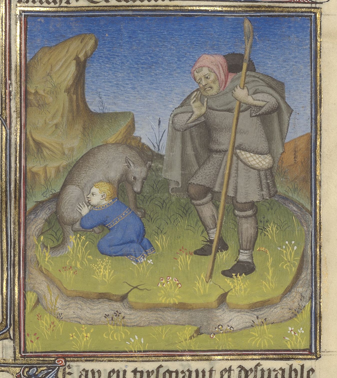 Parigi, Bibliothèque de l'Arsenal, 5193, f. 73r. Un pastore trova il giovane Ciro allattato da una cagna.