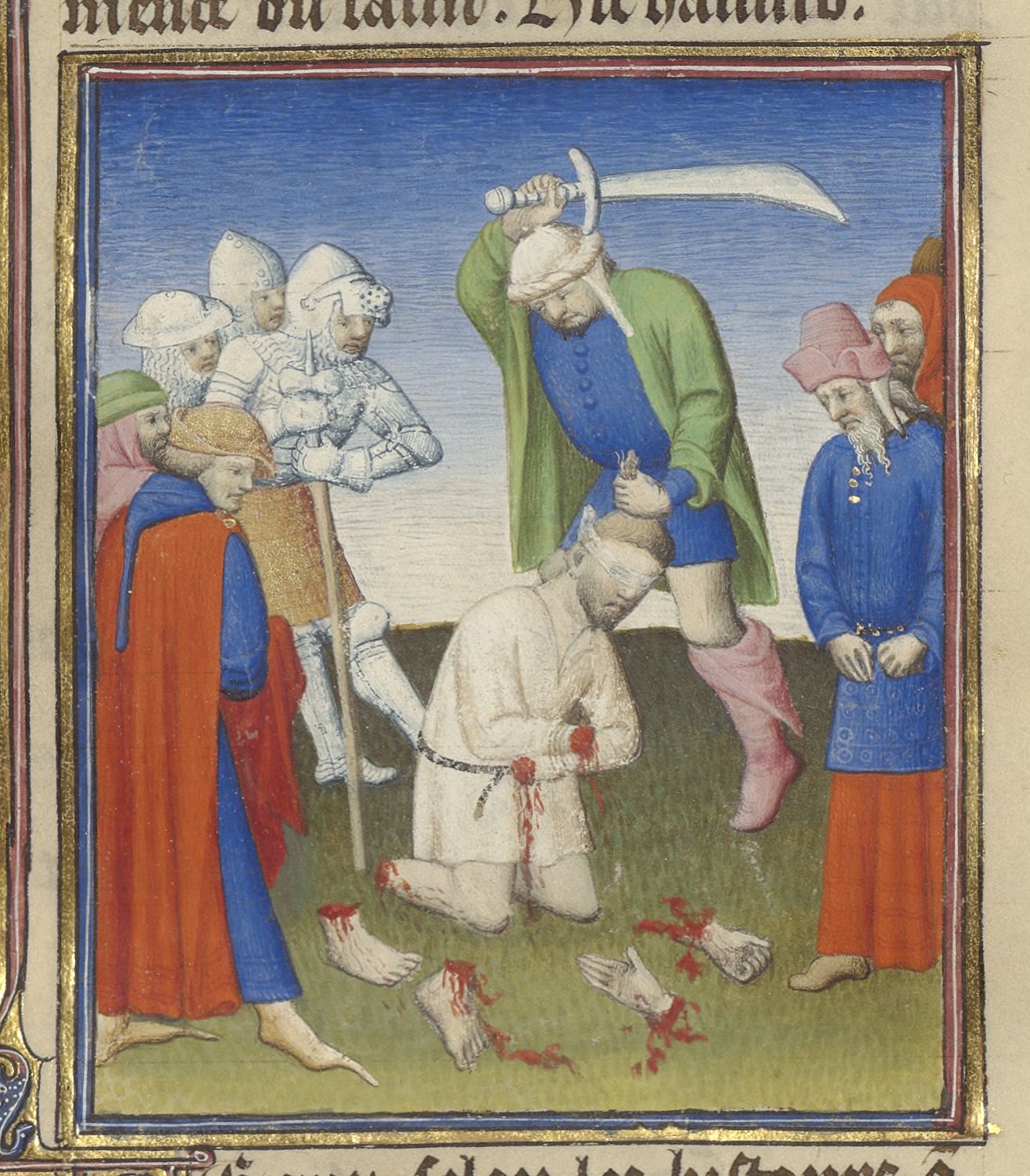 Parigi, Bibliothèque de l'Arsenal, 5193, f. 127r. Annone viene fatto a pezzi e giustiziato al centro di un capannello di spettatori.