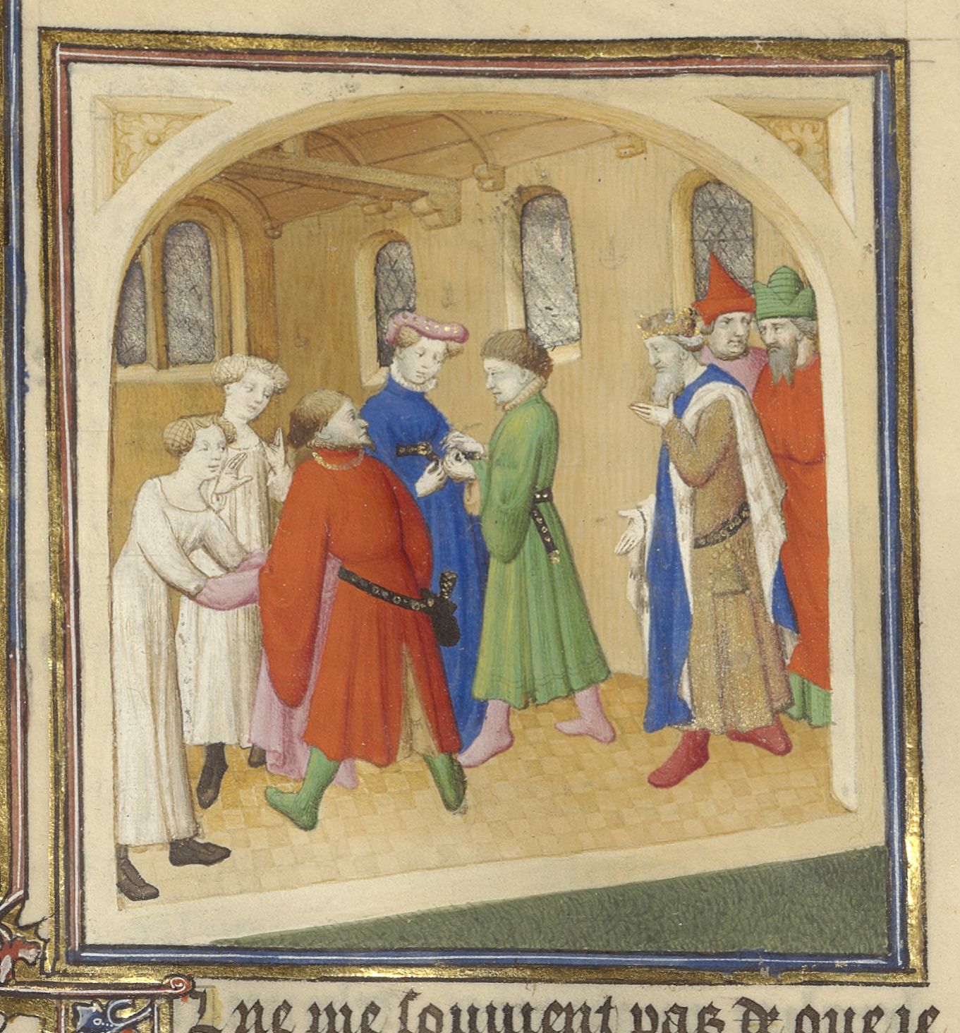 Parigi, Bibliothèque de l'Arsenal, 5193, f. 141v. Dionisio II, tiranno di Siracusa, fa rapire le mogli dei cittadini di Locri e le costringe a svestirsi.