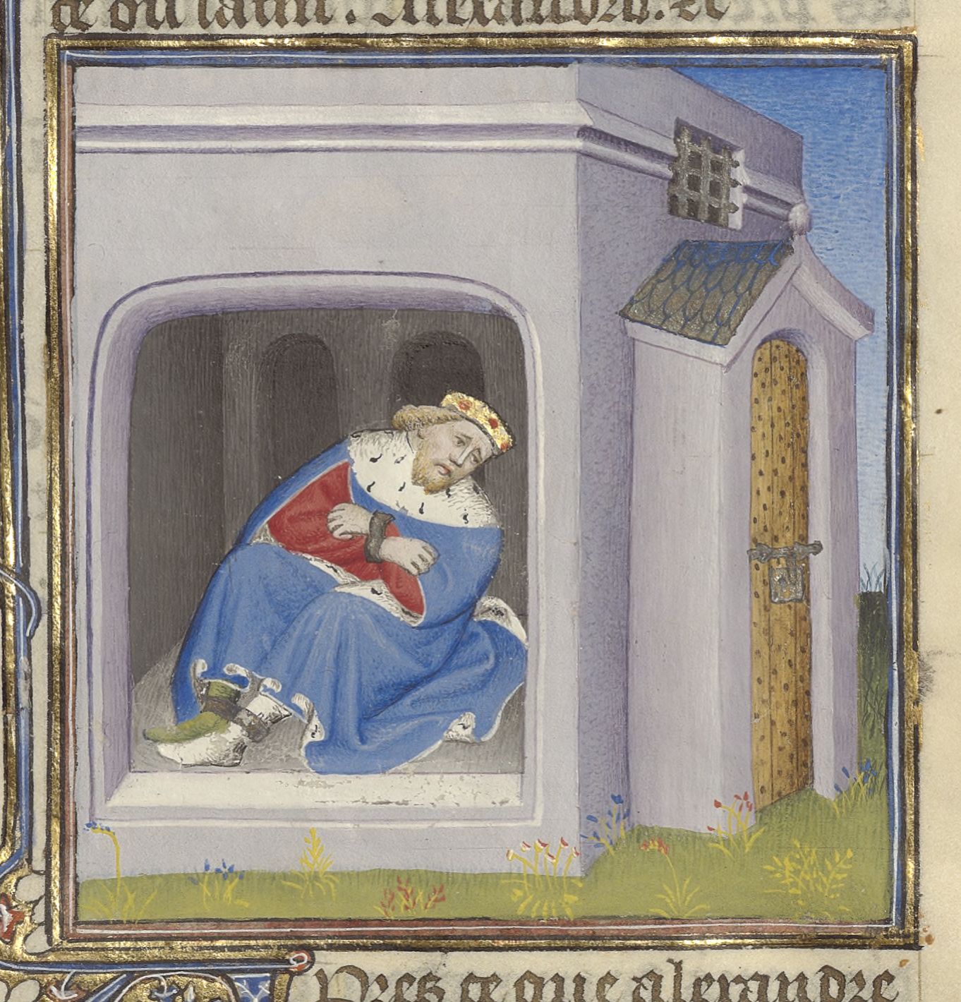 Parigi, Bibliothèque de l'Arsenal, 5193, f. 157r. Re Eumene rinchiuso in catene in prigione.