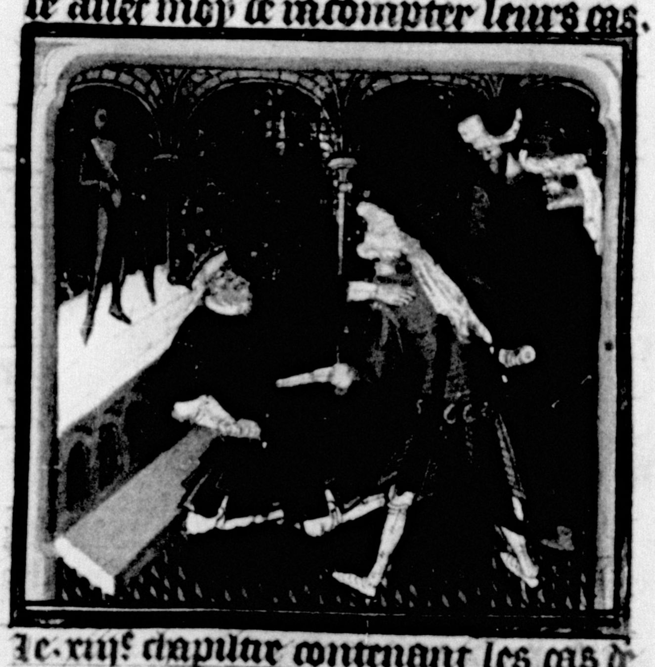 Parigi, Bibliothèque Nationale de France, Fr. 226, f. 24r. Neottolemo (Pirro) uccide re Priamo mentre questi è inginocchiato in preghiera dinanzi a un altare.