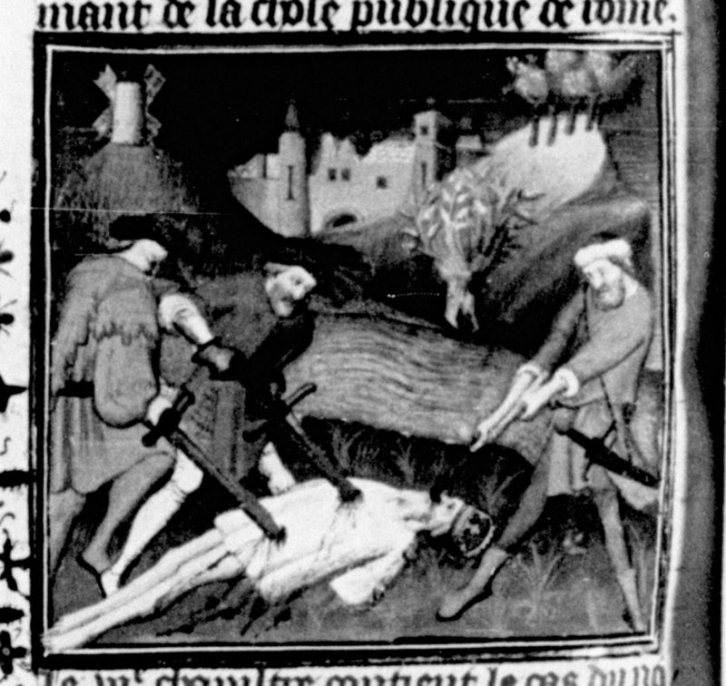 Parigi, Bibliothèque Nationale de France, Fr. 226, f. 201v. Tre uomini uccidono l'imperatore Vitellio e lo trascinano con un uncino per il naso.