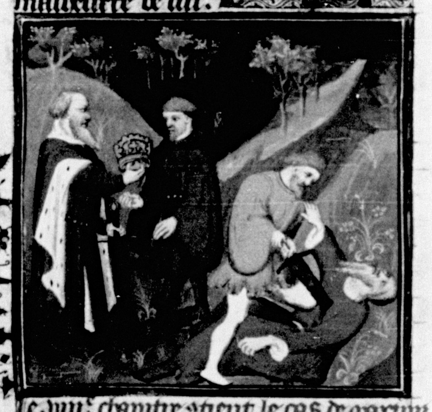 Parigi, Bibliothèque Nationale de France, Fr. 226, f. 221v. Massimiano Erculeo viene costretto ad abdicare; Massimiano viene assassinato da Costantino.