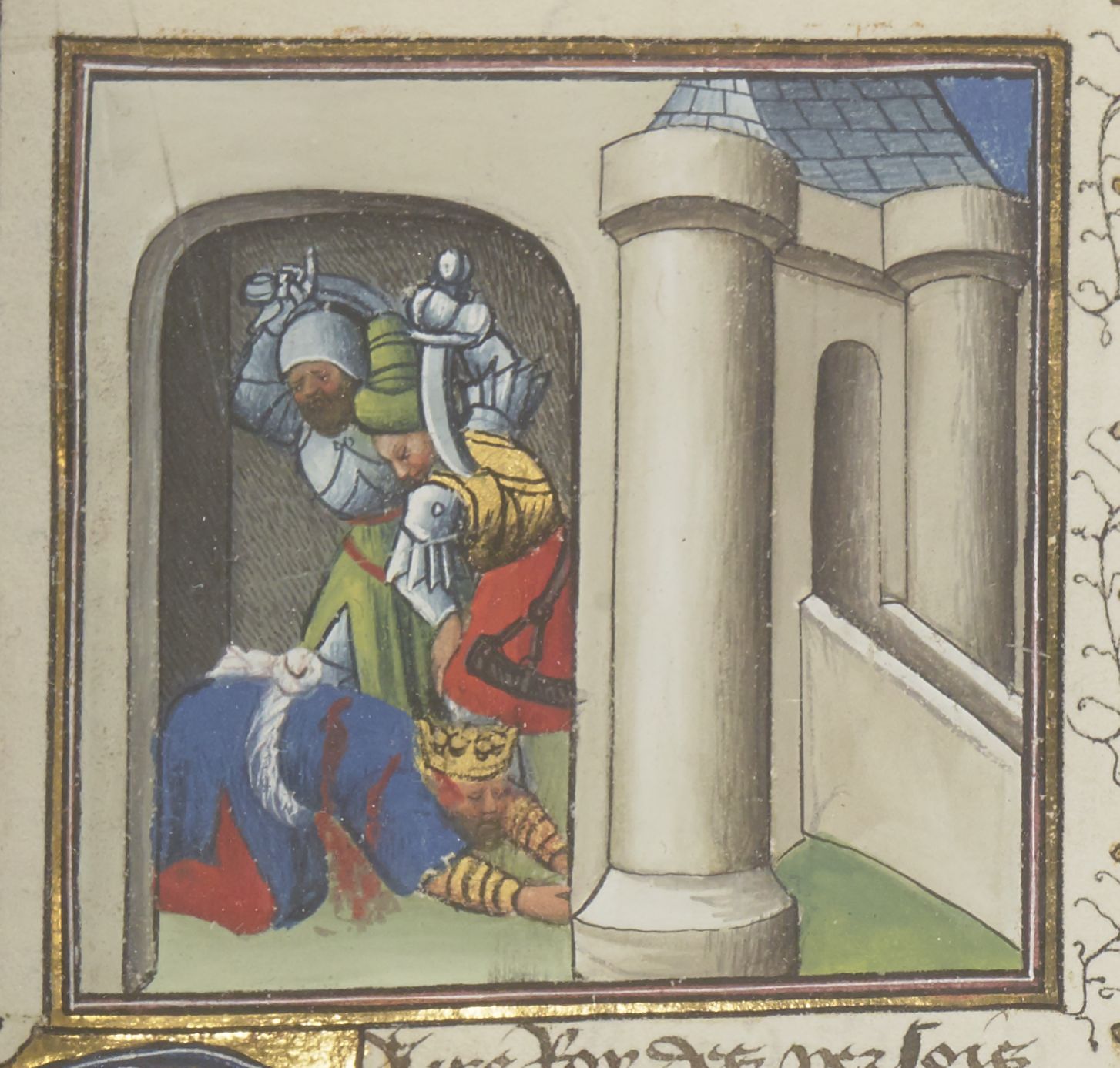 Parigi, Bibliothèque Nationale de France, Fr. 229, f. 104r. Il copista del manoscritto è Boniface de Remenant. Serse viene assassinato nel suo palazzo.