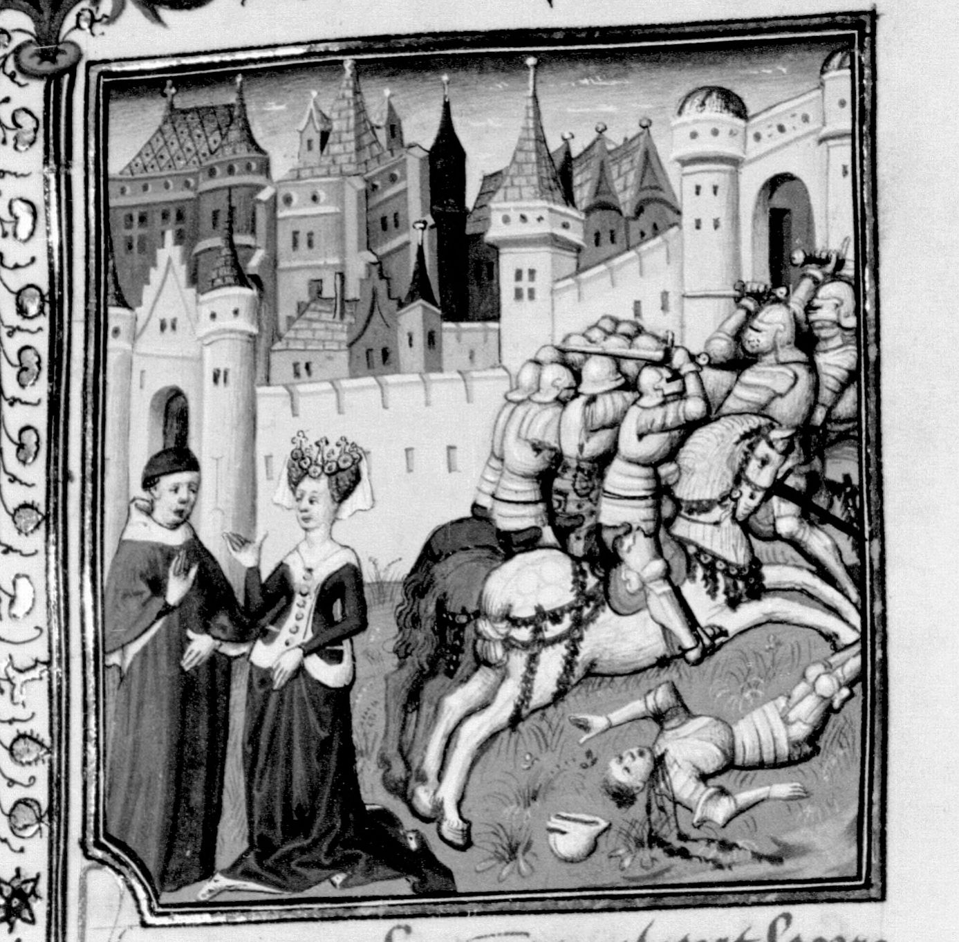 Parigi, Bibliothèque Nationale de France, Fr. 236, f. 48r. L'autore Giovanni Boccaccio discute con la Fortuna, rappresentata come una dama incoronata; Metello rimane ucciso in una battaglia fuori le mura di Roma.