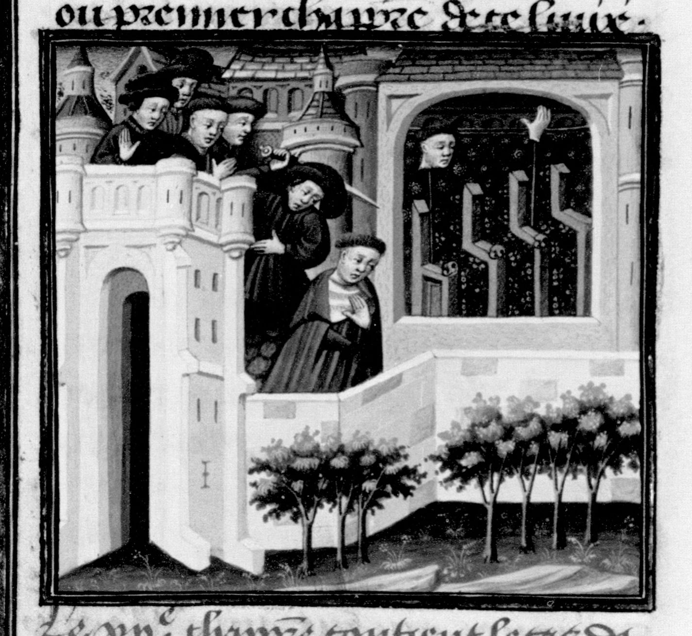 Parigi, Bibliothèque Nationale de France, Fr. 236, f. 85r. Cicerone, cui è stata amputata la mano destra, viene decapitato; la mano e la testa di Cicerone vengono esposte in un'aula del Senato.