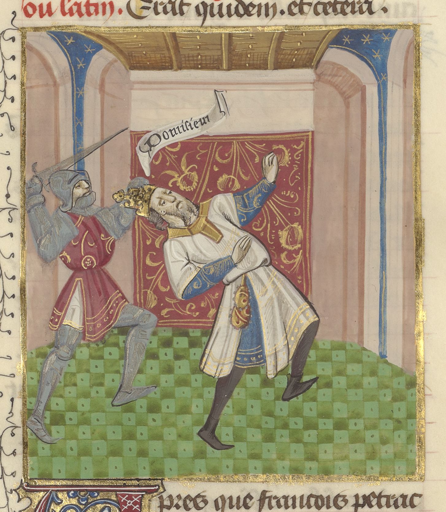 Parigi, Bibliothèque de l'Arsenal, 5192, f. 261v. L'imperatore Domiziano viene assassinato da un soldato.
