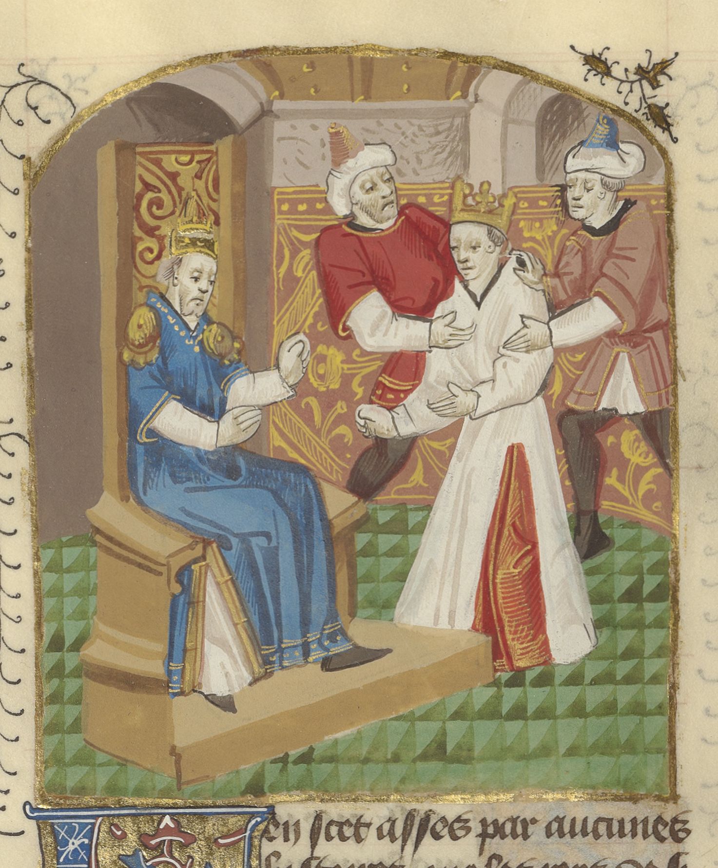 Parigi, Bibliothèque de l'Arsenal, 5192, f. 323v. Guglielmo III viene condotto prigioniero dinanzi all'imperatore Arrigo.