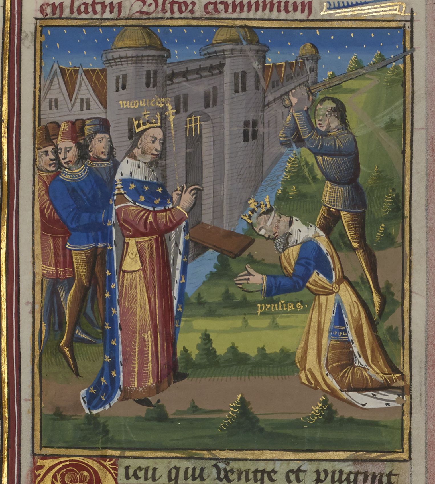 Parigi, Bibliothèque Nationale de France, Fr. 234, f. 56r. Re Nicomede ordina l'esecuzione del padre Prusia II di Bitinia.