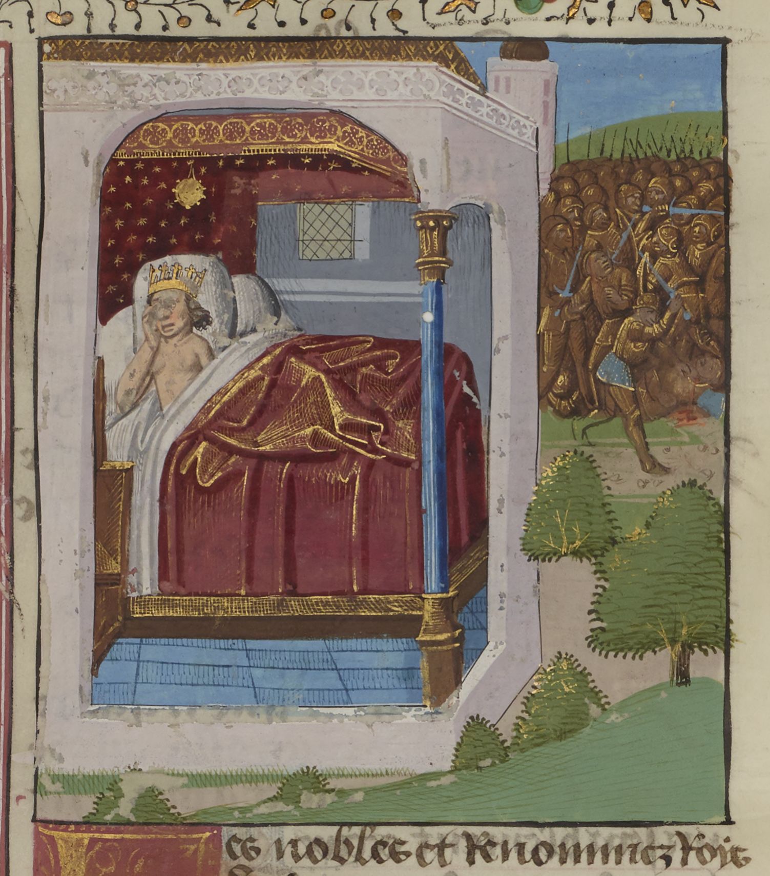 Parigi, Bibliothèque Nationale de France, Fr. 234, f. 192v. Re Carlo d'Angiò giace a letto malato; le truppe di Carlo sconfiggono l'esercito di Manfredi.