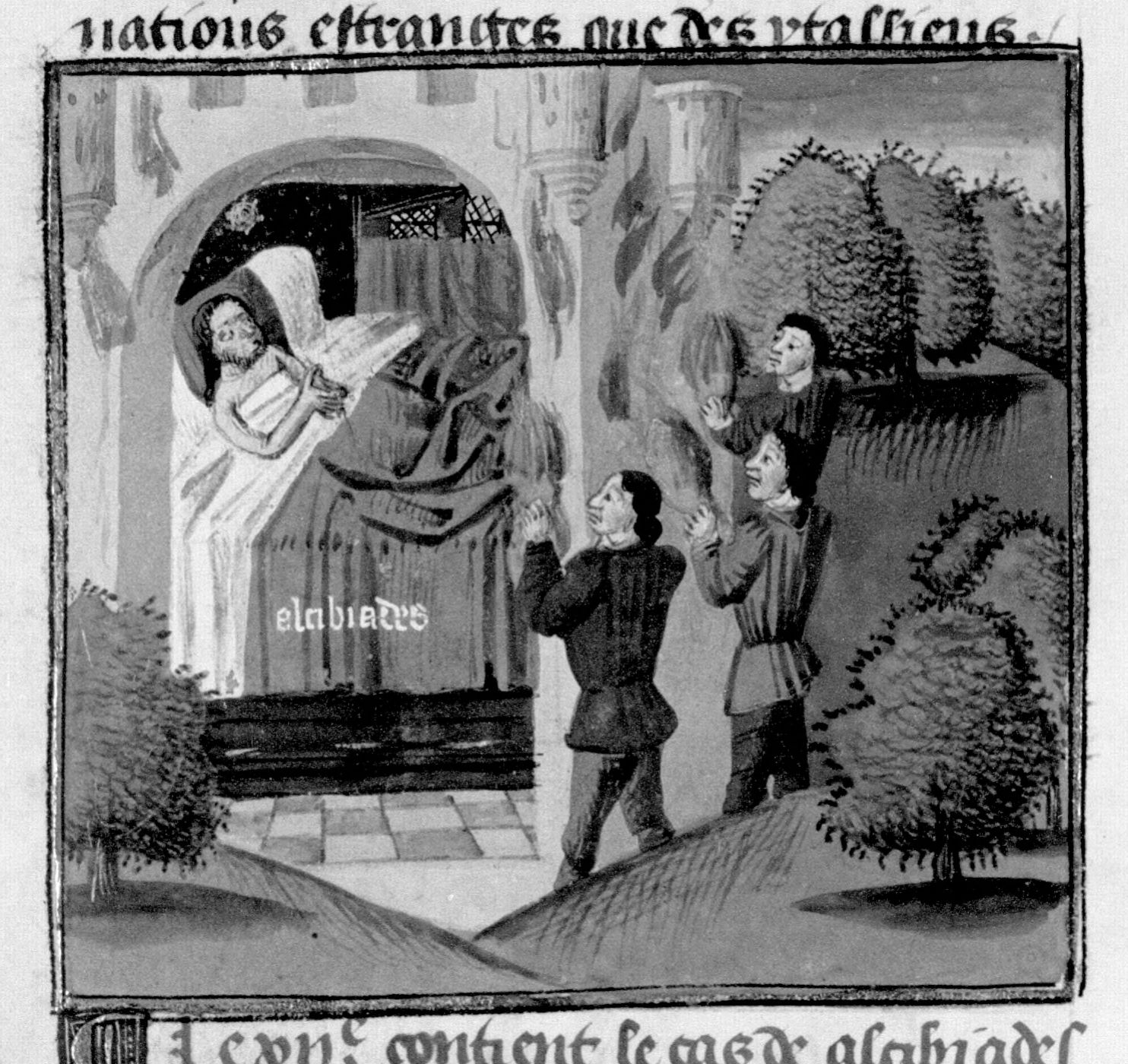 Parigi, Bibliothèque Nationale de France, Fr. 230, f. 83v. Il copista del manoscritto è P. Droulin. Tre sicari armati di torce danno fuoco alla residenza di Alcibiade.