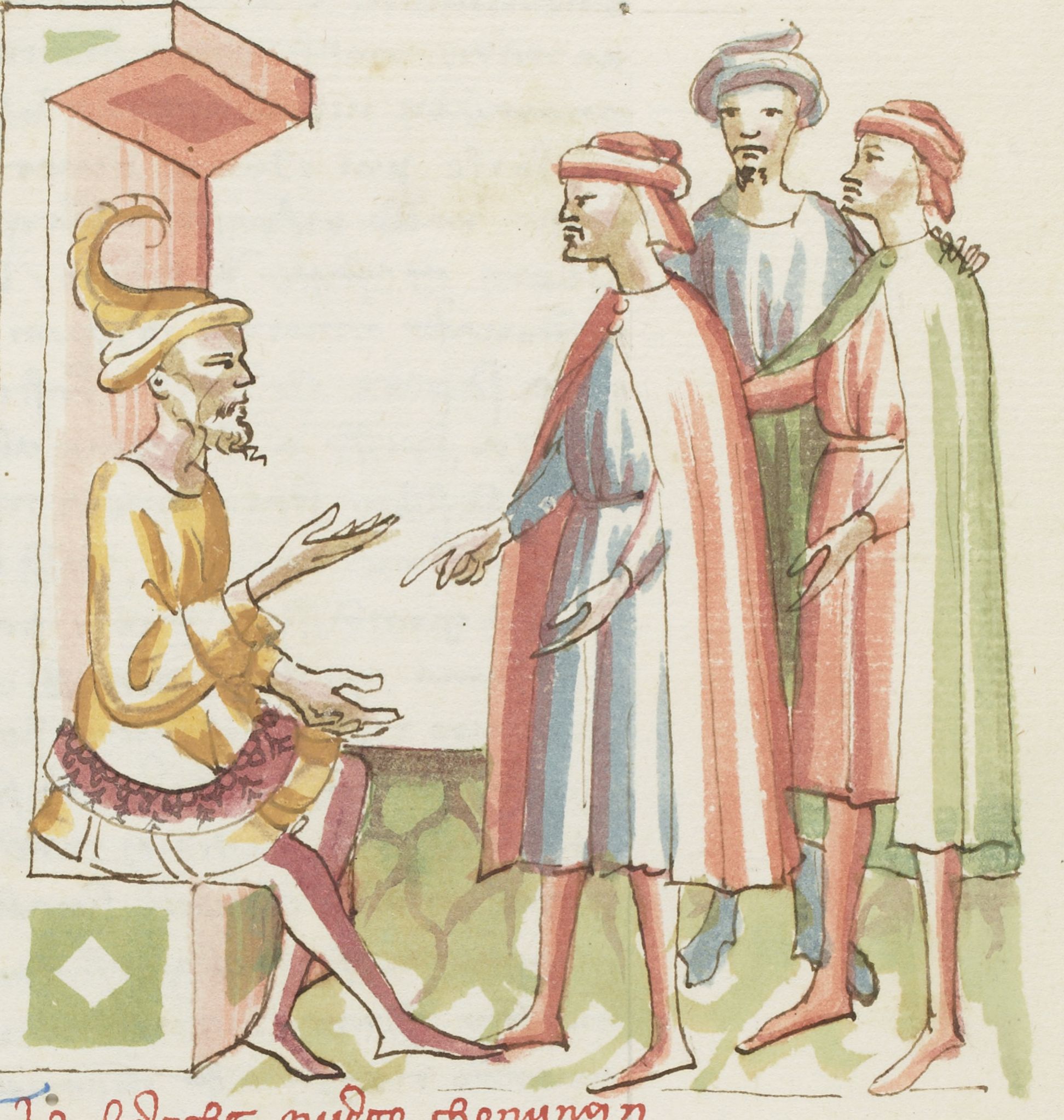 Parigi, Bibliothèque Nationale de France, It. 63, f. 19r. Il copista del manoscritto, datato 10 ottobre 1427, è Ludovico di Salvestro Ceffini. Melchisedech viene ricevuto dal Saladino insieme ad altri due uomini.
