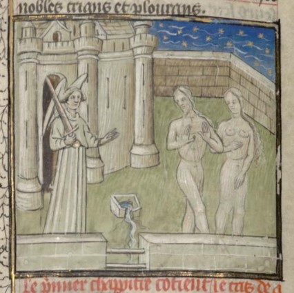 Parigi, Bibliothèque interuniversitaire Sainte-Geneviève, 1128, f. 2v. Adamo ed Eva vengono cacciati dal Paradiso Terrestre da un angelo con la spada sguainata.